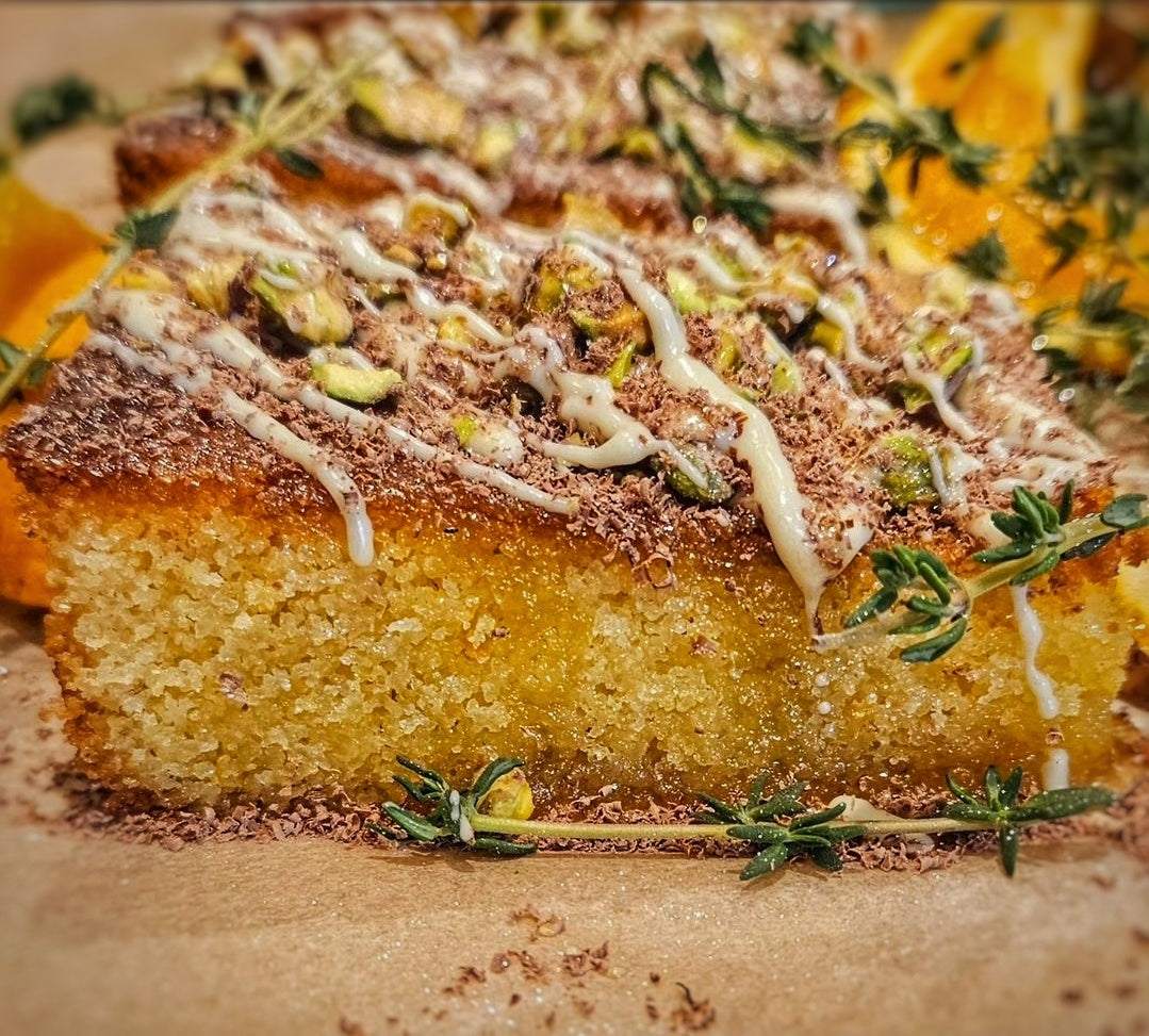 This orange-infused cake has a good balance between zesty orange and aromatic thyme, creating an unforgettable taste. It then gets a drizzle of white chocolate and a generous sprinkling of roasted pistachios to add a satisfying crunch. It's finished off with an orange and thyme infused syrup that's poured on top. All this creates a taste that lingers in your mouth after the last bite.